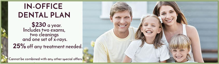 Don’t have dental insurance? Join our in-house dental plan for just $230/year! Each plan includes 2 exams, 2 cleanings, and 1 set of x-rays. We’ll even knock 25% off any needed treatment! *Cannot be combined with any other special offers.